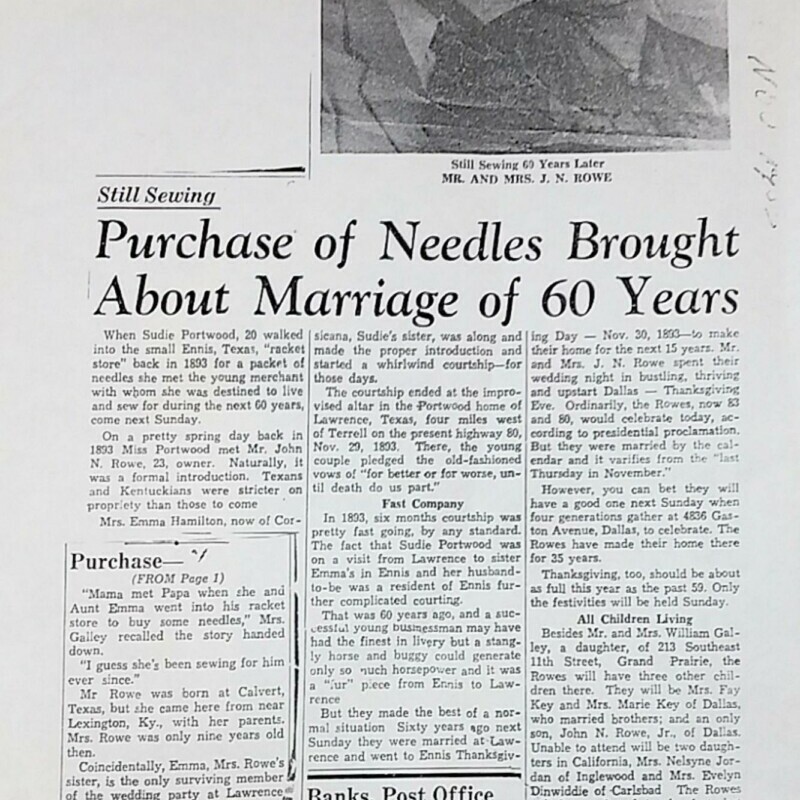 As said by their daughter in an article celebrating their 60th wedding anniversary, “Mama met Papa when she and Aunt Emma went into his racket store to buy some needles. I guess she’s been sewing for him ever since.”