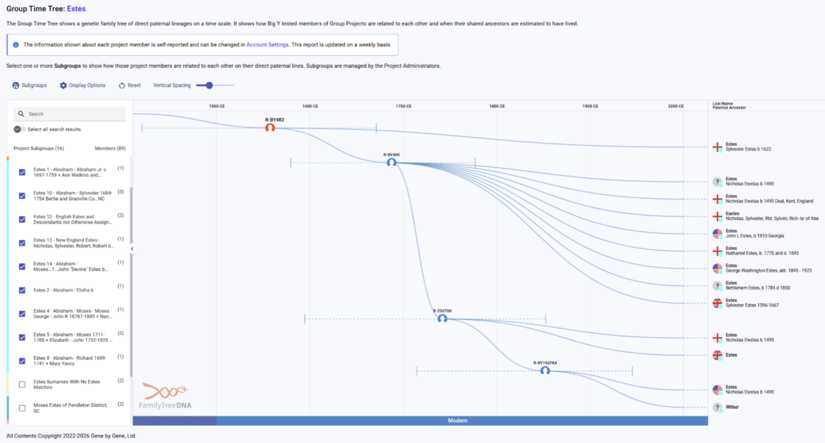 Screenshot of the Estes Group Project Group Time Tree showing descendant lines connected through a shared Y-DNA haplogroup.