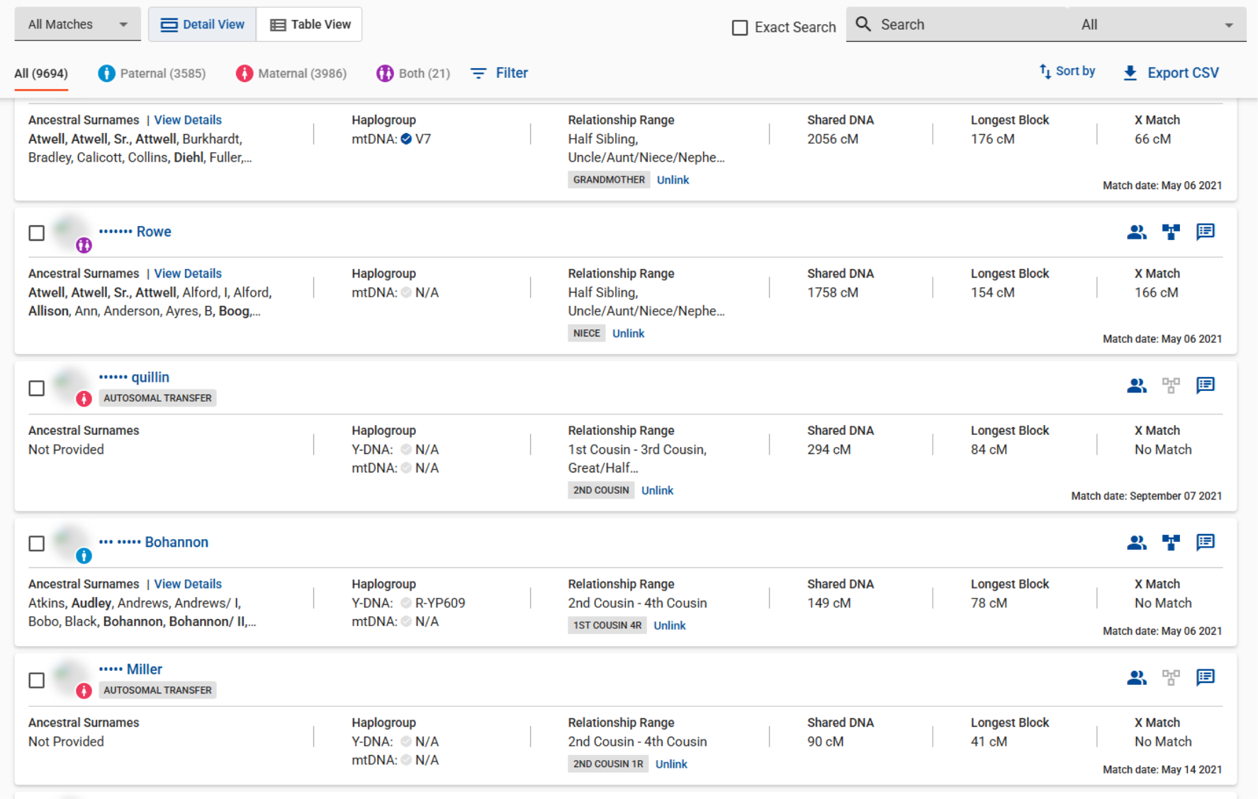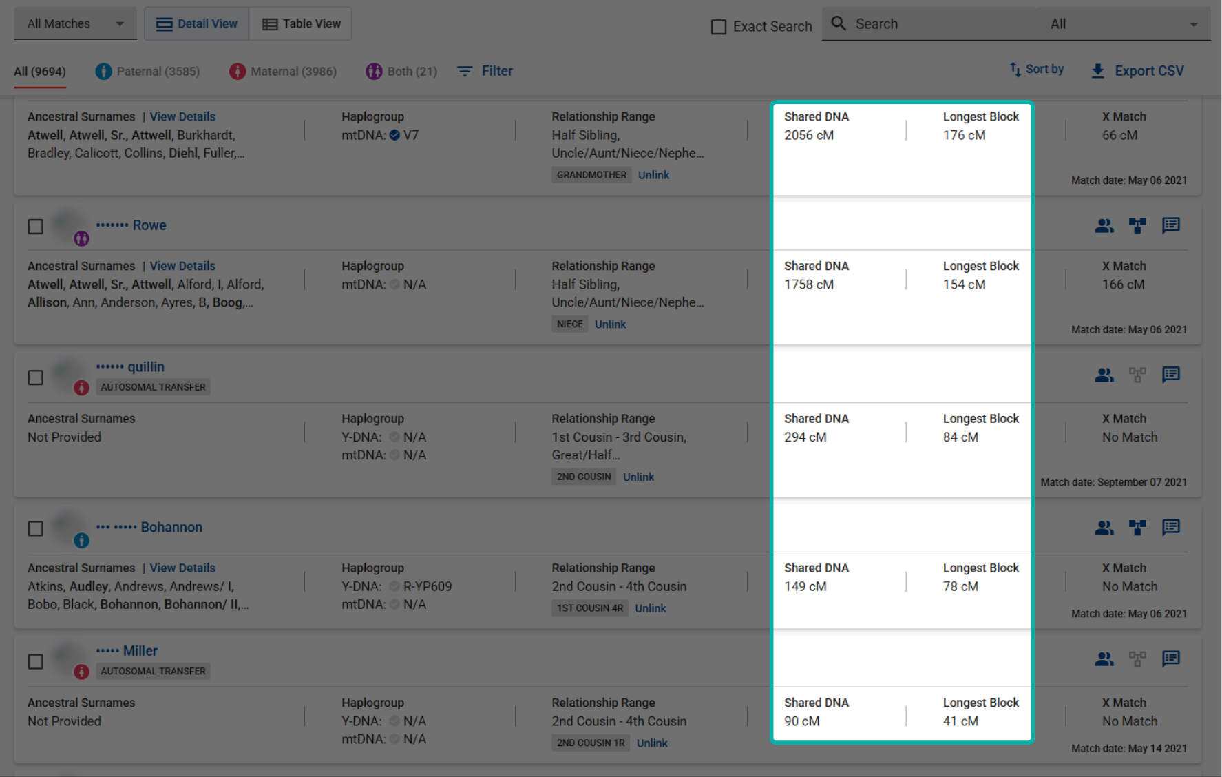 The Matches page includes several tools to help you sort, filter, and analyze your DNA matches: