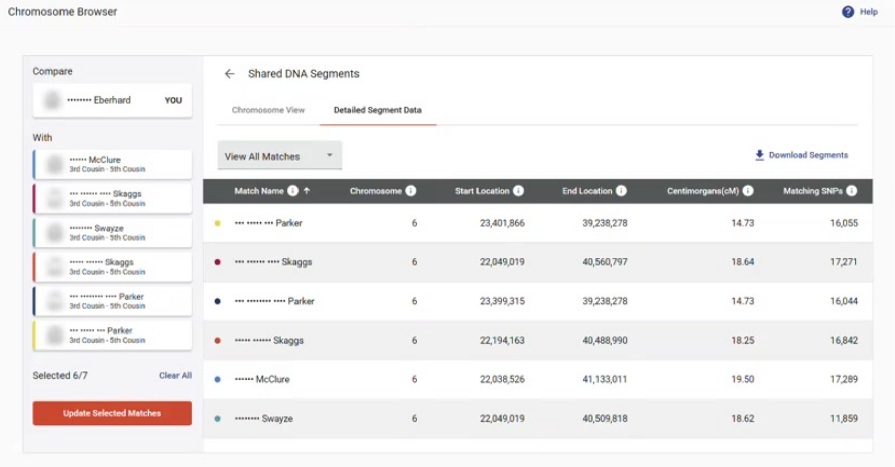 You can also view detailed segment data for each match, including the chromosome location and size of each shared segment.