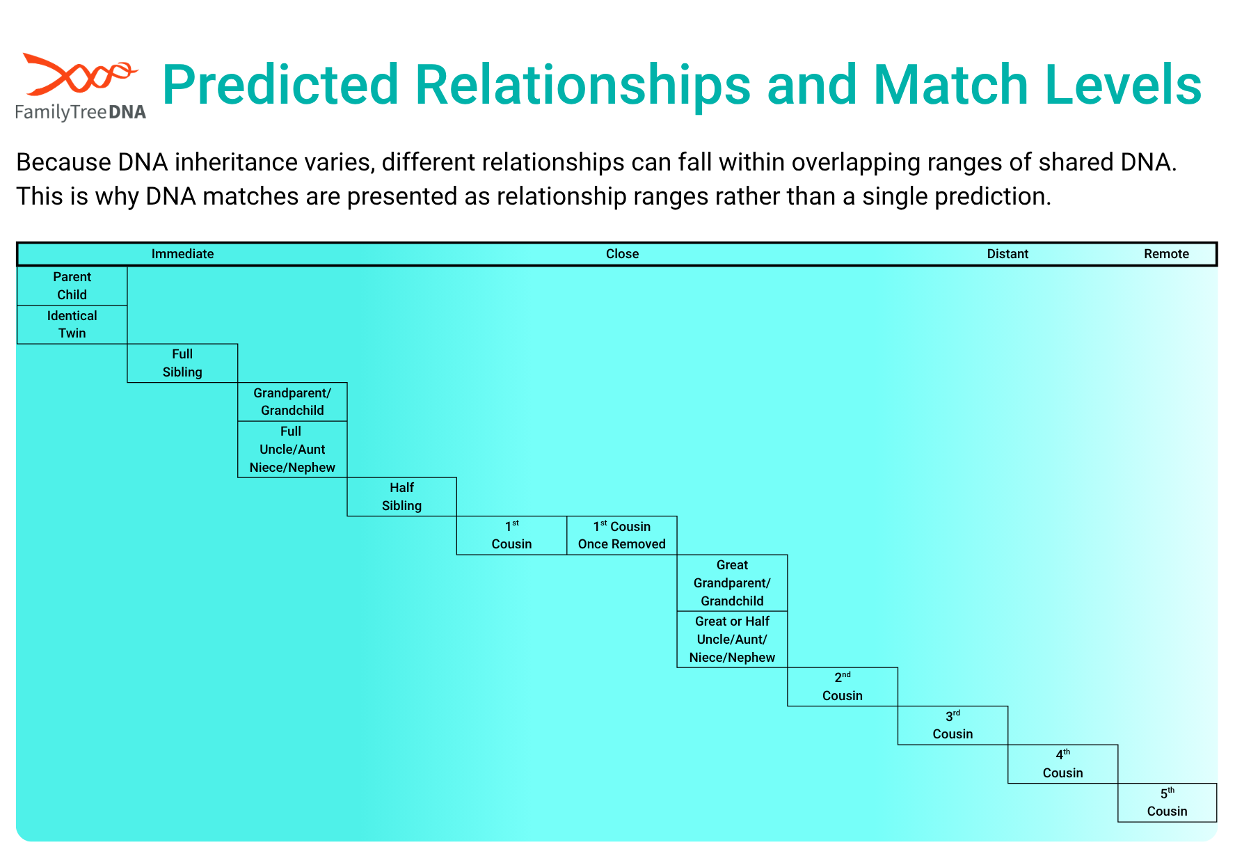 Because of this, FamilyTreeDNA provides a predicted relationship range for each match that contains various possibilities.