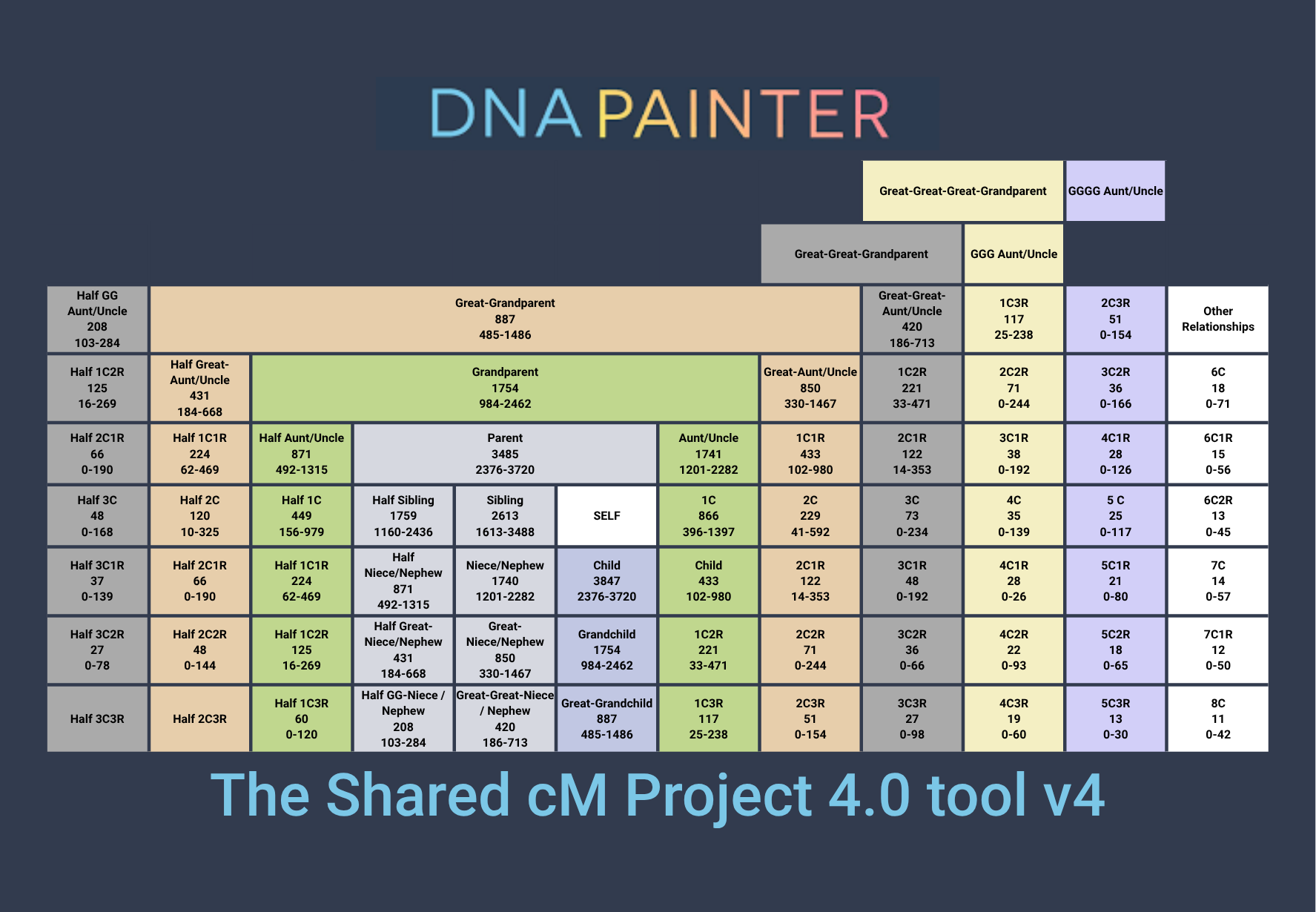 The chart below, from DNA Painter’s Shared cM Project, shows the typical ranges of DNA shared between different types of relationships.