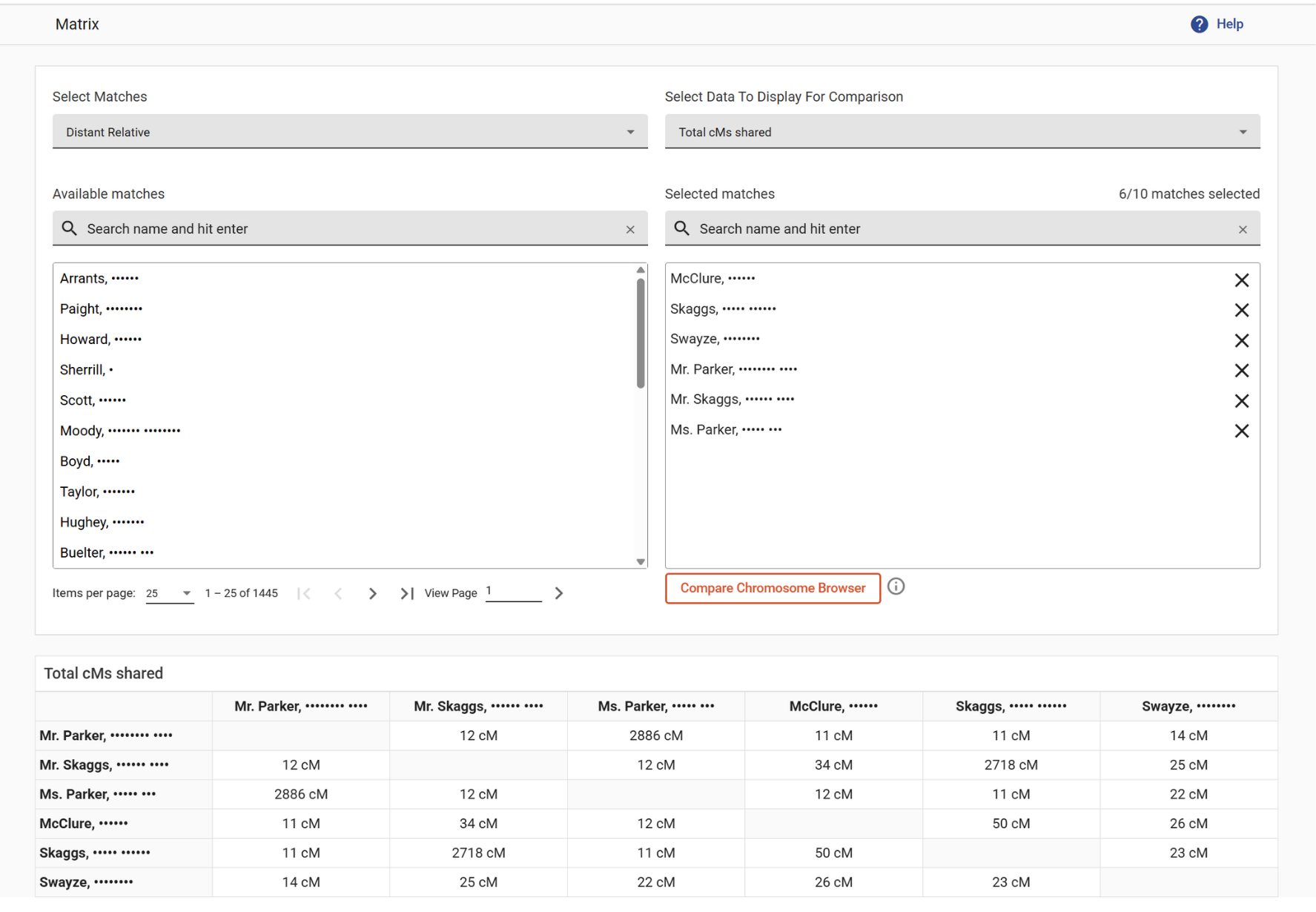 - Chromosome Browser Selection: Select matches to compare shared DNA segments.