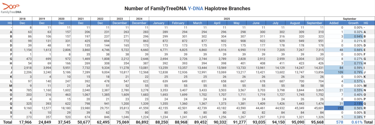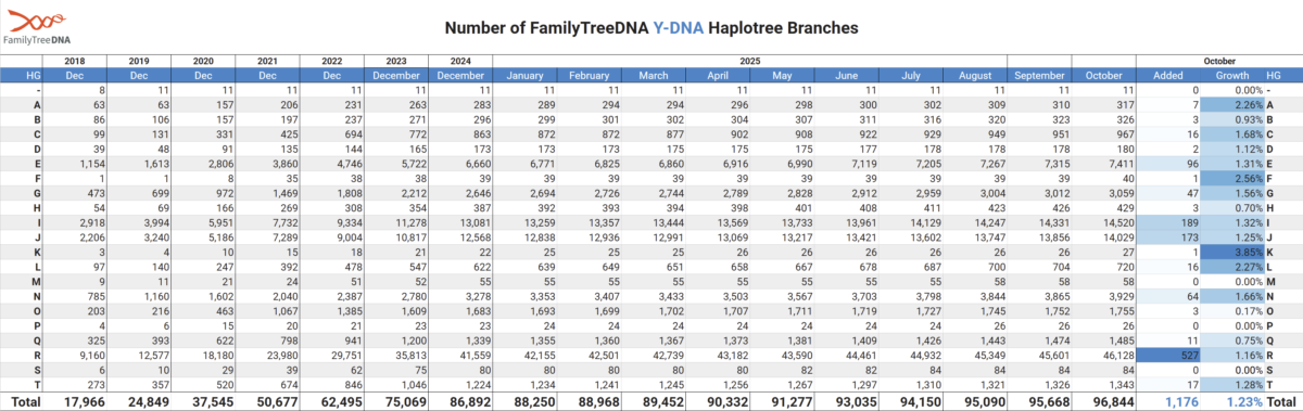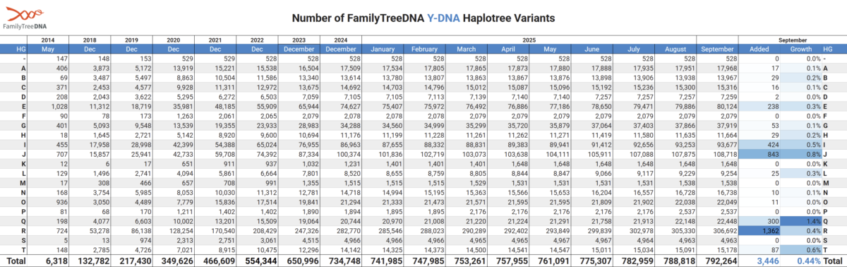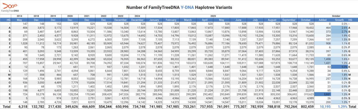 Every month, we provide updates to reflect the latest haplotree growth in both branches and variants, and to highlight patterns, discoveries, and standout haplogroups. Whether you’re a genetic genealogist, population researcher, or DNA enthusiast, these numbers offer a glimpse into how the story of humanity continues to unfold — one Y chromosome at a time.