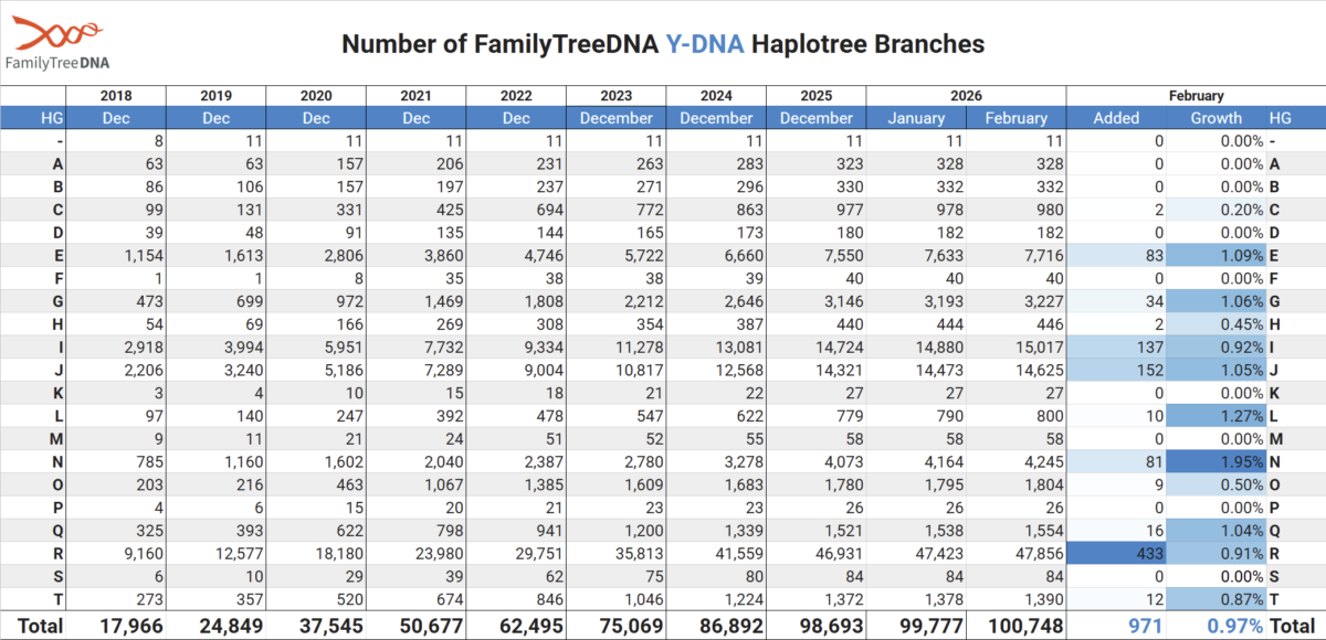 - Haplogroup N: +81 branches (+1.95%) – highest % growth
