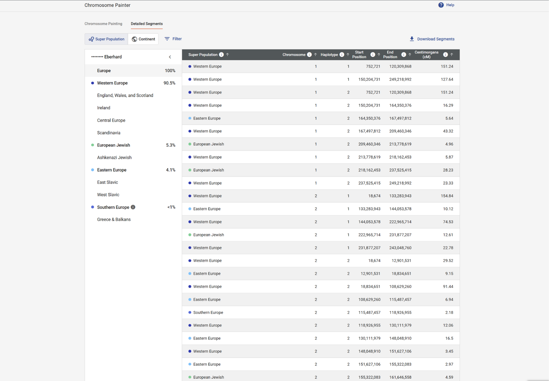 The Detailed Segments view presents your chromosome painting data in a table format.