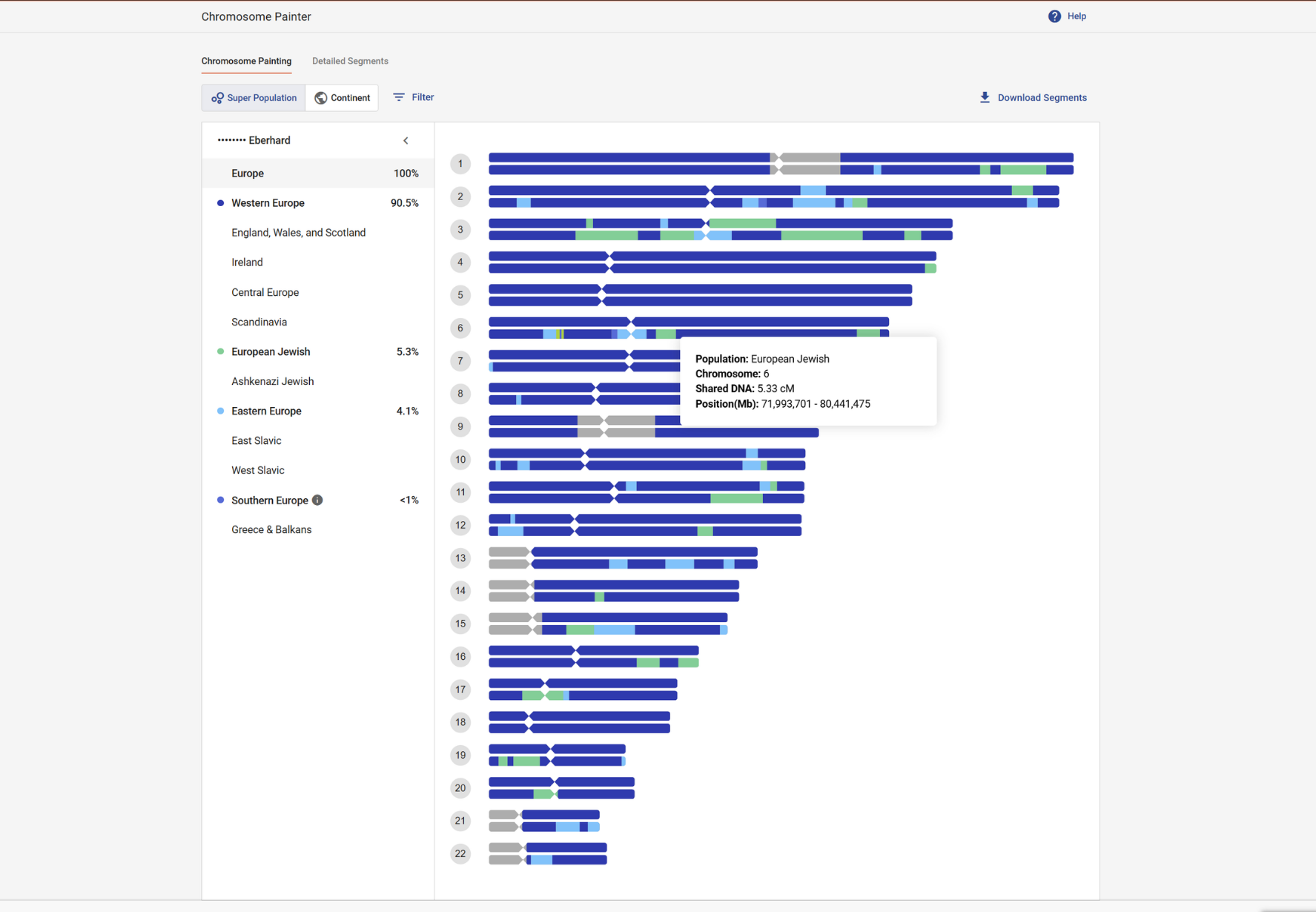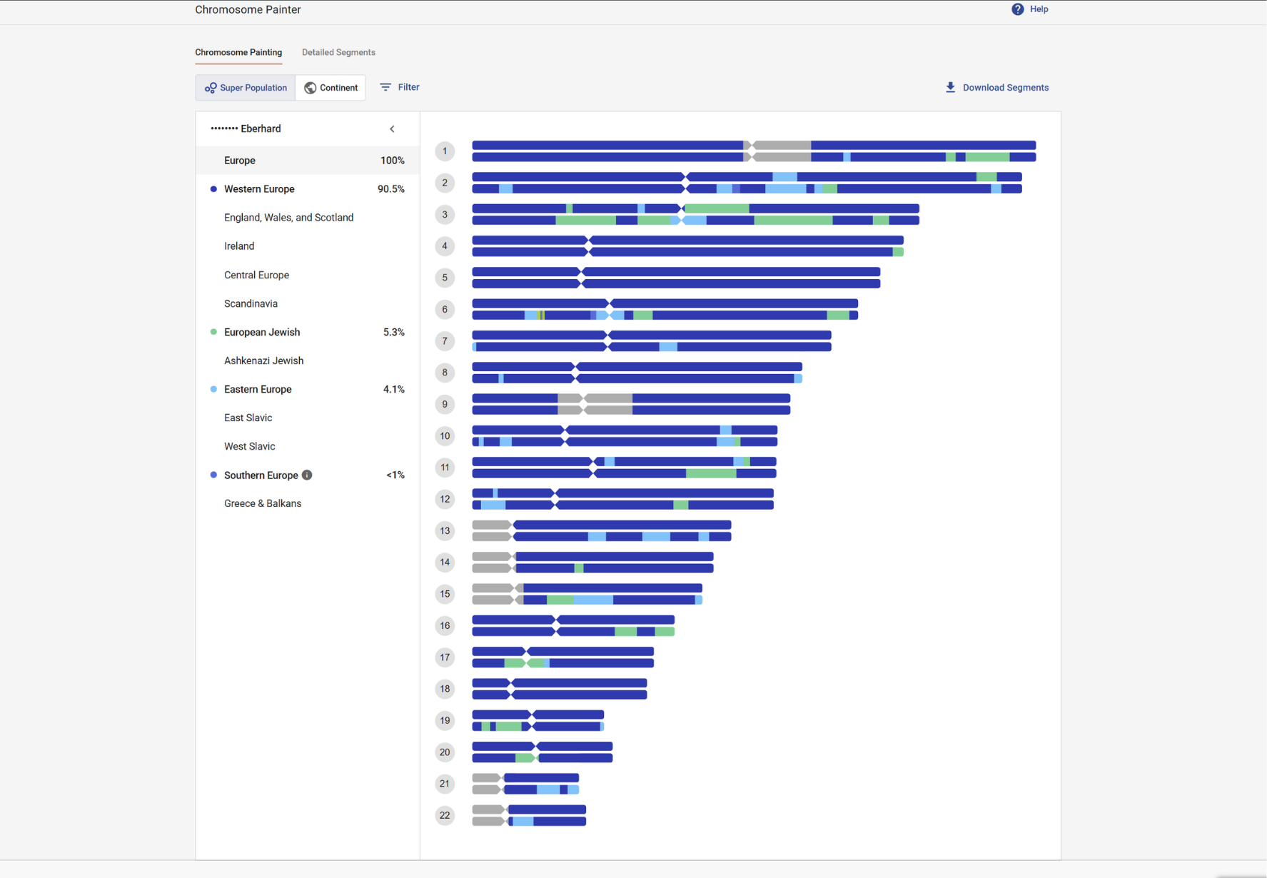 Once your DNA has been assigned to population segments, you can explore those results visually using the Chromosome Painter interface.