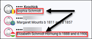 Jim’s maternal EKA is Sophia Schmidt, a surname that was later anglicized to Smith. One of his matches listed their EKA as Elizabeth Schmidt Hornung, born in 1888 and deceased in 1930. Hornung is likely a married name.