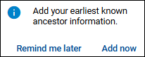 Screenshot of a FamilyTreeDNA notification prompting users to add their Earliest Known Ancestor (EKA) information. The message offers two options: 'Remind me later' or 'Add now' to complete the update.