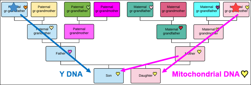 Diagram showing the paternal and maternal EKA. Y-DNA follows the direct paternal lineage (blue path), while mtDNA is passed through the direct maternal lineage (pink path). Understanding these inheritance patterns is essential for genetic genealogy research.