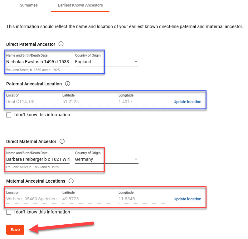 Screenshot of the FamilyTreeDNA 'Earliest Known Ancestors' section. The image highlights fields for entering direct paternal and maternal ancestors' names, birth/death dates, and countries of origin. Locations, latitude, and longitude details are also shown, with a red arrow pointing to the 'Save' button to finalize updates.