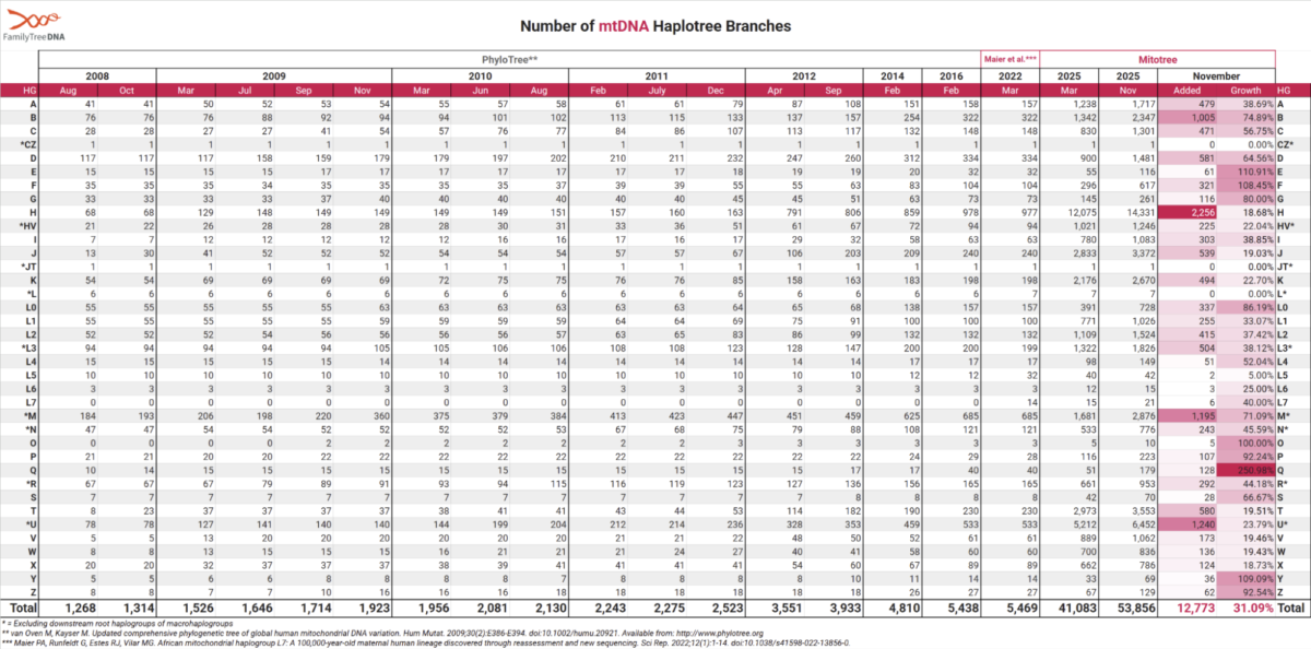 The Updated mtDNA Tree of Humankind has received its second major expansion of the year, adding more than 12,700 new mtDNA haplogroups and bringing the tree to 53,836 total branches—more than a 30% increase since March.